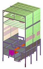 このため、ブース上部から下部へ自動車ボディに沿って一様な気流を作り、ブースの下部では強い水膜を作って、空気と塗料ミストを吸い込んでいます。