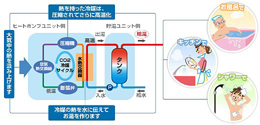エコキュ-トとは大気中の熱を利用してお湯を沸かすシステムのこと。